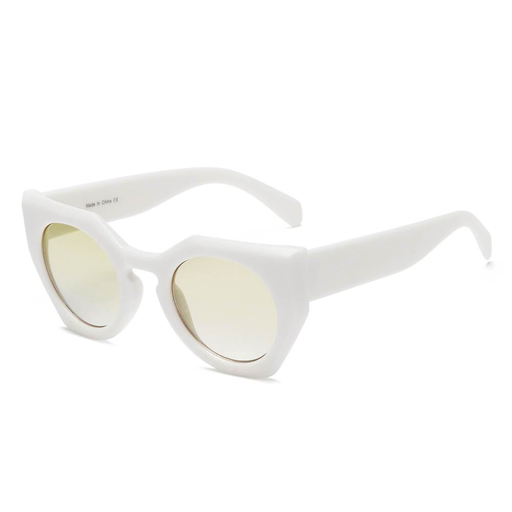 Geometric sunglass featuring thick Temple Arms along with a Round(ish) CatEye Frame, also integrated with a Keyhole Bridge for the Nose Area.
